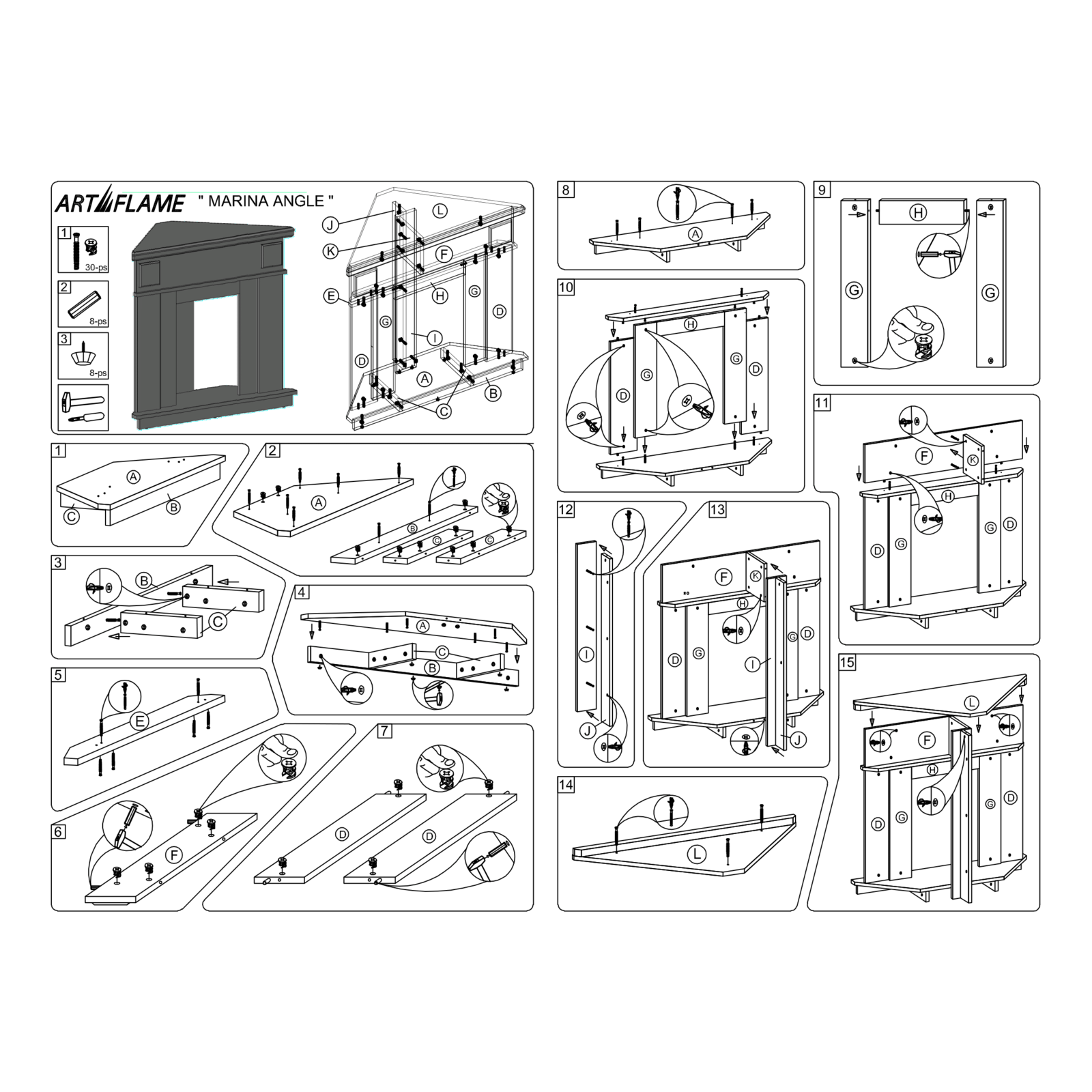 Кутовий електрокамін Marina & Galileo Silver, Art Flame, 1000x1000x500 мм, 2000 Вт, термостат, 5 рівнів яскравості полум’я, таймер