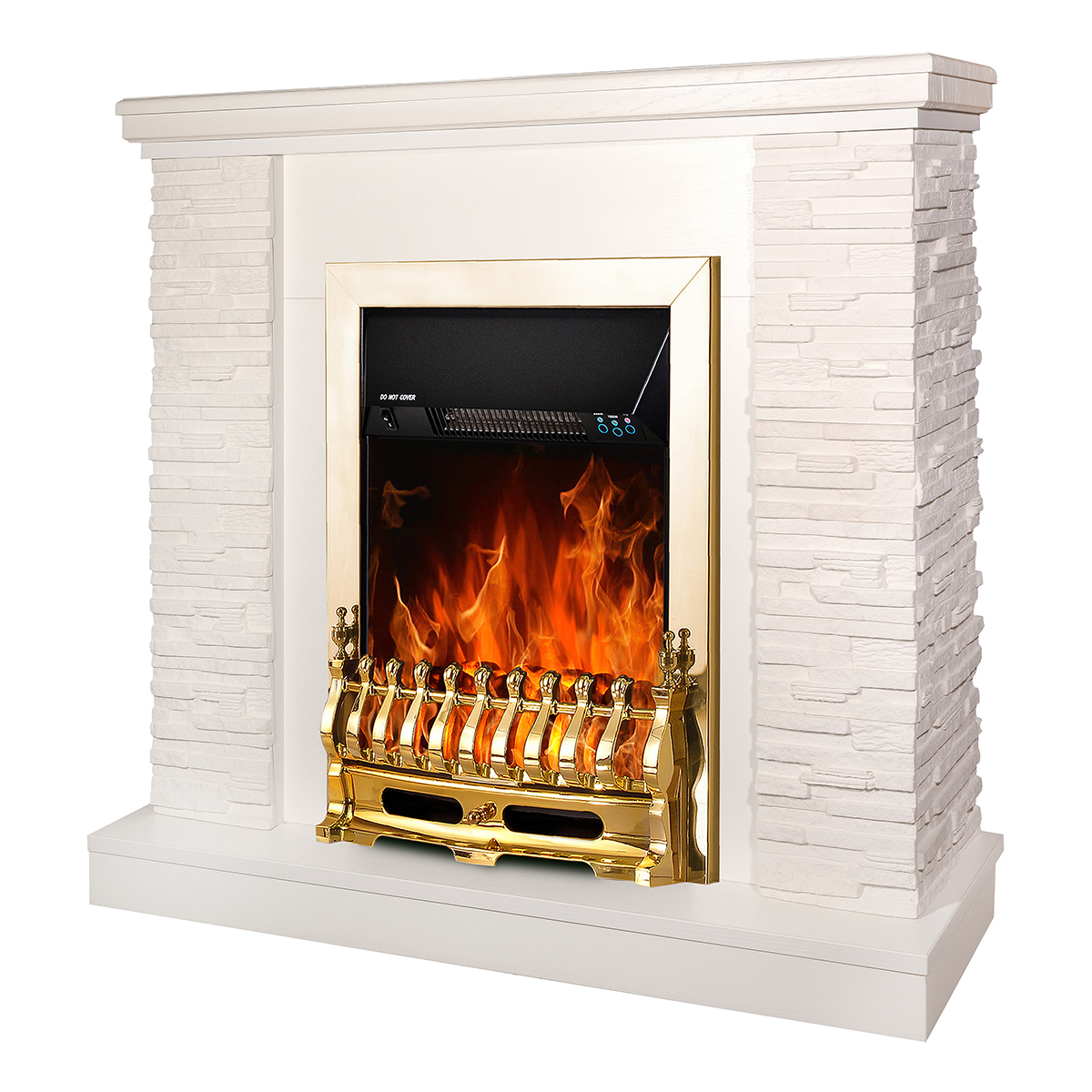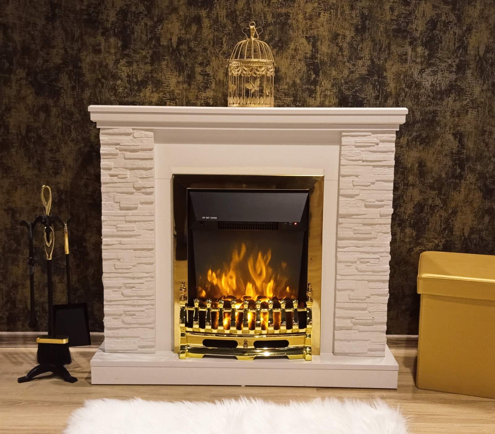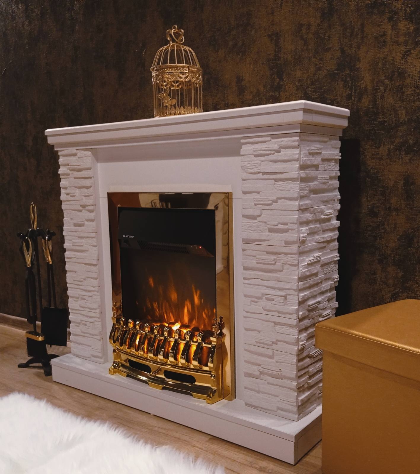 Fireplace set Rock & Galileo Gold will perfectly fit into a country house or apartment. Portal Rock perfectly combines classic and modern styles. It is made in brown and white with artificial stone on the columns. A high-quality imitation of the Galileo Gold electric fireplace flame will give you a great feeling of comfort. The functionality of this model allows you to use the flame simulation mode separately from the heating mode, it has a remote control panel.