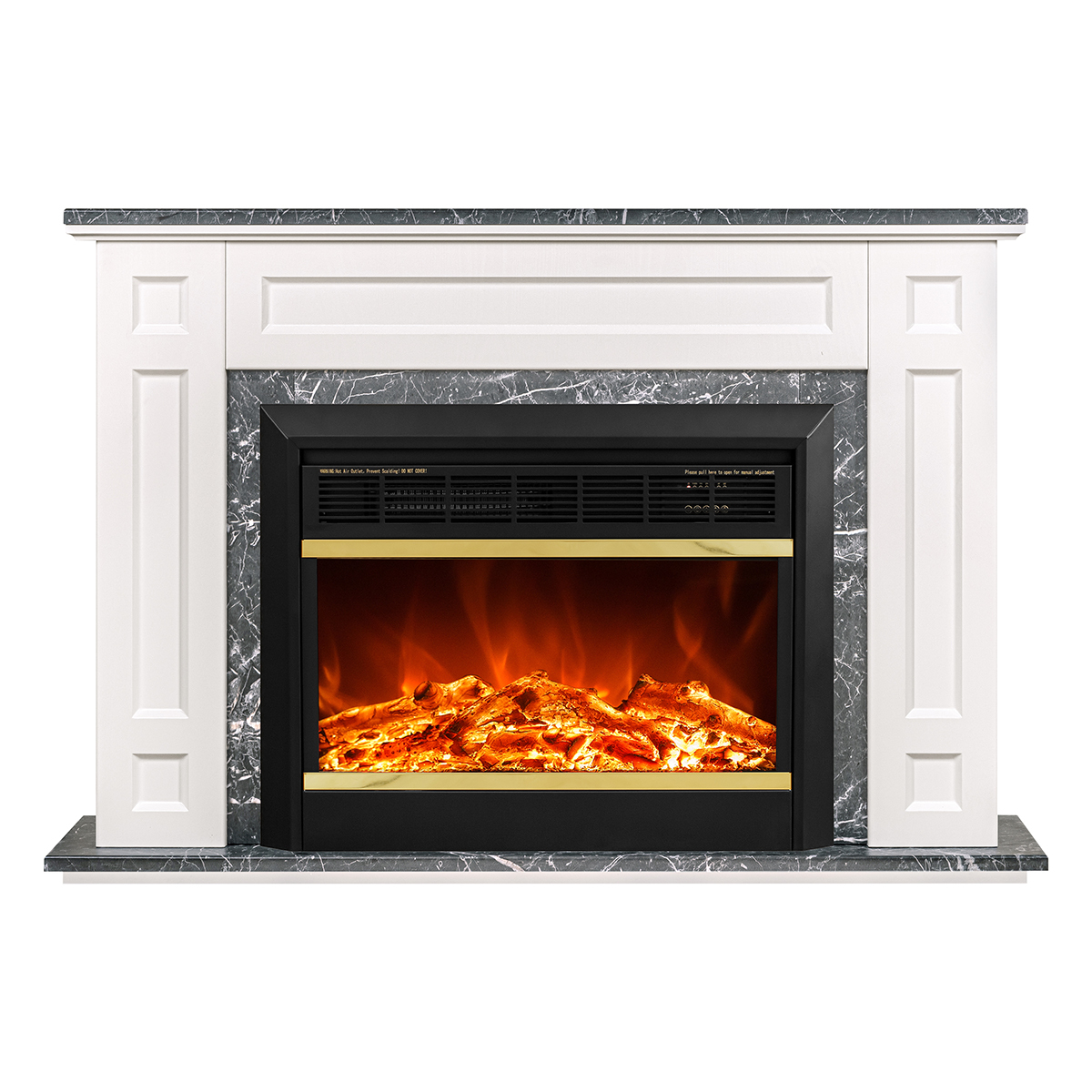 Electric fireplace "Mars", made in a standard format with gold inserts. The device is capable of operating in 2 modes: in decorative mode and heating mode. In decorative mode, the device creates a cozy atmosphere with a high-quality simulated flame, the brightness of which can be changed using the remote control that comes with the kit. In heating mode, the electric fireplace is able to heat a room with an area of 15m2. Overheating protection is responsible for the safety of the fireplace.