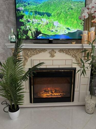 Electric fireplace "Richie" is a device made in a dark design with thin gold inserts. In decorative mode, the electric fireplace creates a believable flame simulation not only with the help of visual decoration, but also due to the new sound simulation technology. In heating mode, the device is able to heat a room of 20m2. Overheating protection is responsible for the safety of the fireplace. And also included with the fireplace set is a remote control with which you can adjust the brightness of the flame, the sound level and switch heating modes.